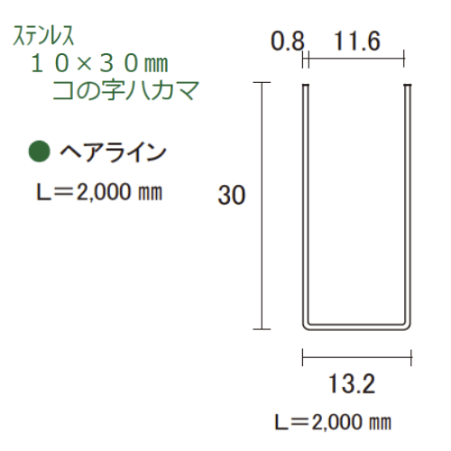 ステンレス/10x30mmコの字ハカマ/ヘアライン/11.6x30x2000mm