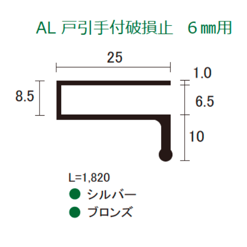 アルミ/6mm用戸引手付破損止/シルバー/25x6.5x1820mm