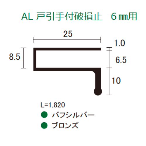 アルミ/6mm用戸引手付破損止/ブロンズ/25x6.5x1820mm
