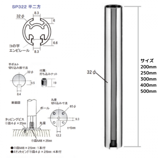 スクリーンポール(SP-32)/ゴールドメッキ/SP322 ポール/平二方/500mm