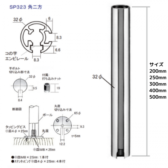 スクリーンポール(SP-32)/ゴールドメッキ/SP323 ポール/角二方/500mm