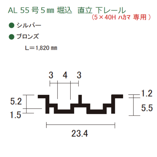 アルミはかま用レール(5mmx40H用)/3線掘込上レール/シルバー/2438mm