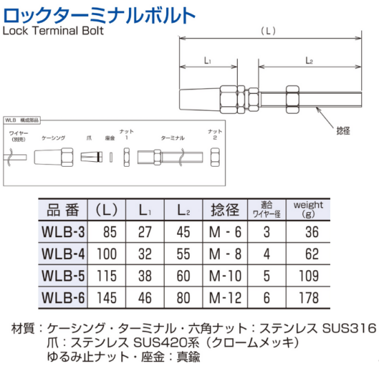■素材:ケーシング・ターミナル・六角ナット:ステンレス316/爪:ステンレスSUS420系(クロームメッキ)/ゆるみ止めナット・座金:真鍮