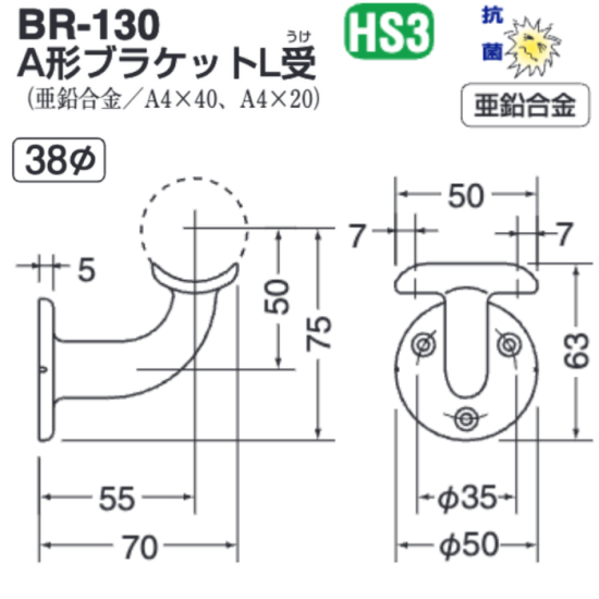 A形ブラケットL受/シルバー/38Φ/BR-130