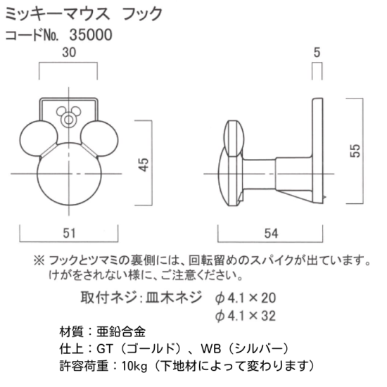 【長沢製作所】35000/ミッキーフック/WB/ディズニー【廃番品残りわずか】