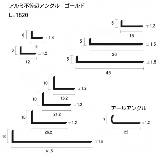 アルミ不等辺アングル/ゴールド/6×12×1.2×1820【メーカー廃止品残りわずか】
