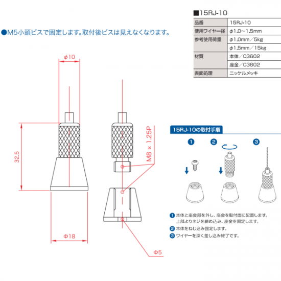 ■参考使用荷重:Φ1.0mm/5kg・Φ1.5mm/15kg