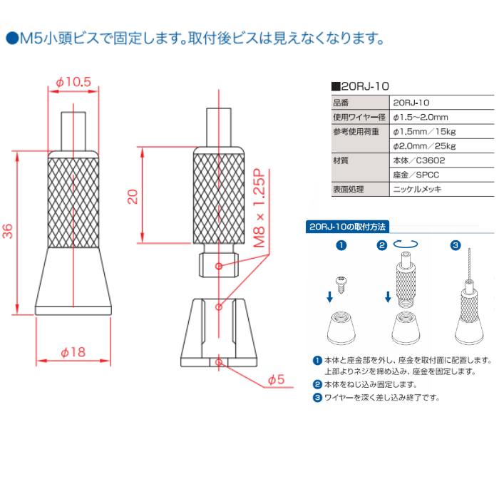 ■参考使用荷重:Φ1.5mm/15kg・Φ2.0mm/25kg